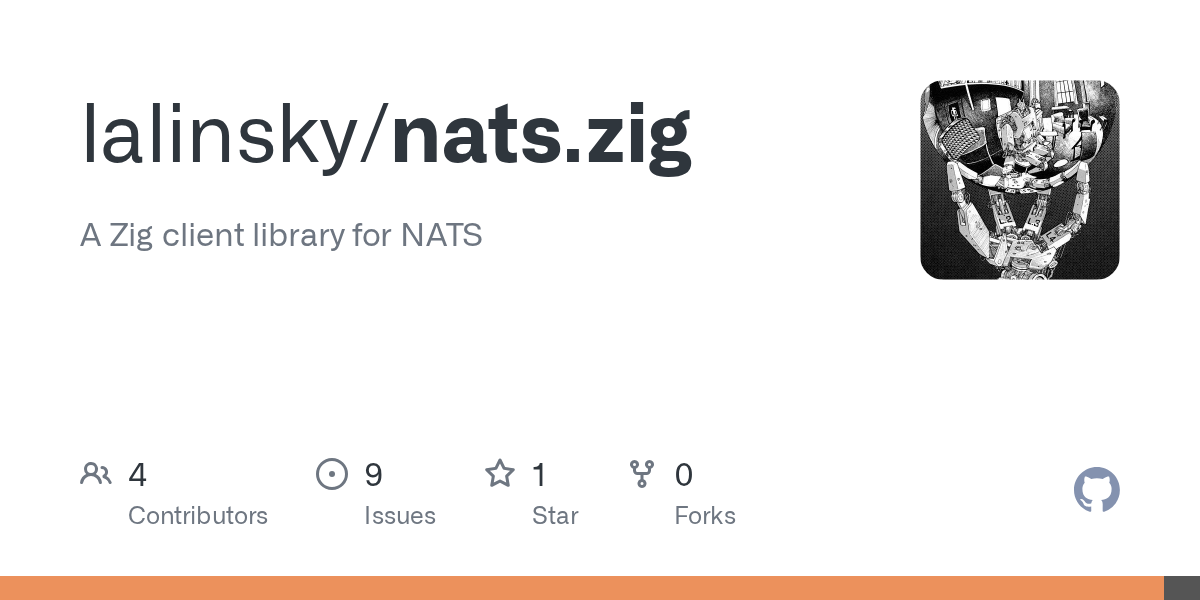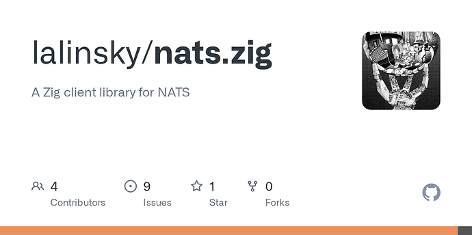 I’ve been working on a NATS client library over the last few weeks. It’s now at the point that I’m happy to share it with others, but definitely not production ready at this point. It’s very much based on the official NATS Go and C libraries, but using Zig idioms. NATS Core should work well, JetStream is not as well tested yet. The goal is to have feature parity with the official client libraries. And the API is also very similar, so if you follow the official docs, the functions names and options they use are named the same here.