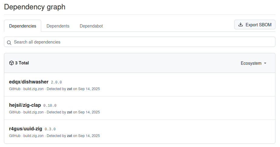 Zat is (in the distant future) meant to automatically discover potential vulnerabilities for you Zig packages (e.g. published via EUVD or via custom advisory databases similar to RustSec). For now, it is at least useful for generating CycloneDX SBOMs, Mermaid dependency graphs and publishing dependencies via the Github dependency publishing API. It currently gathers information from a) the build.zig.zon , resolving transitive dependencies, and b) from build.zig by injecting code into the build.zig and then running zig build -h to create the build graph, which is then parsed.