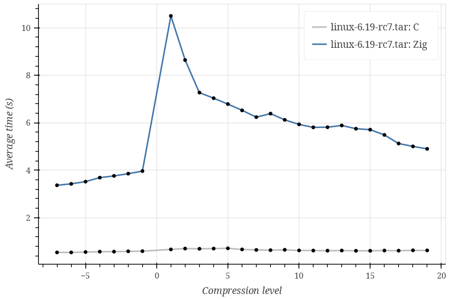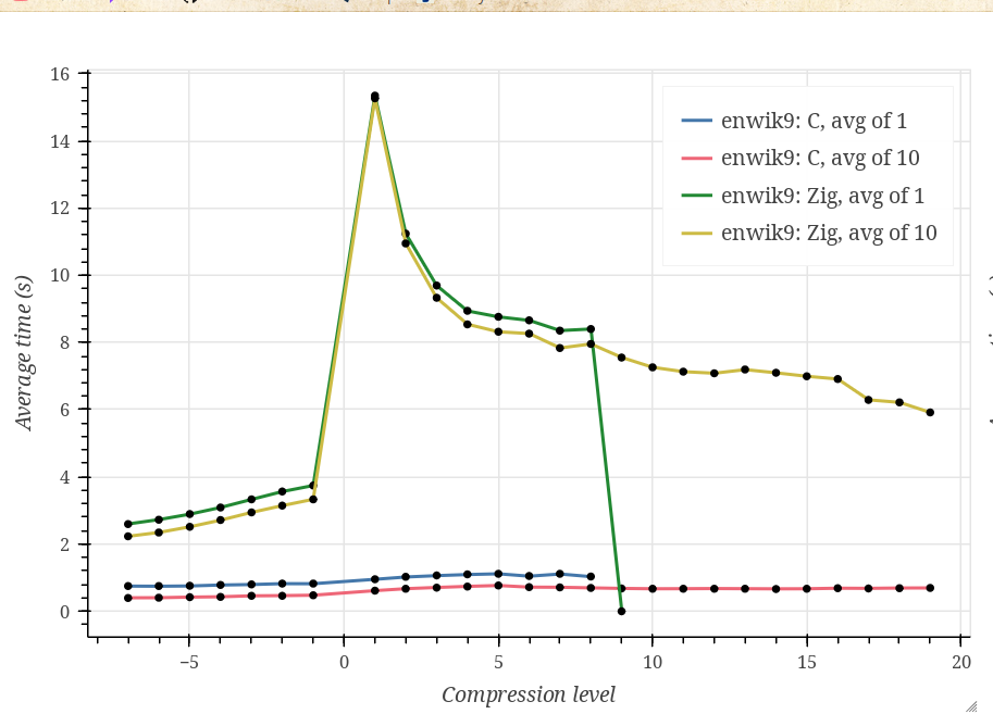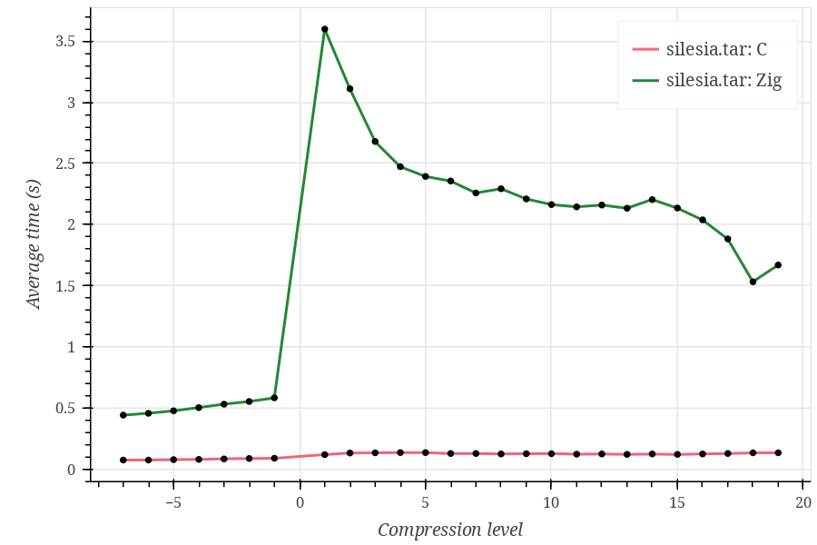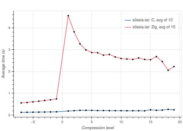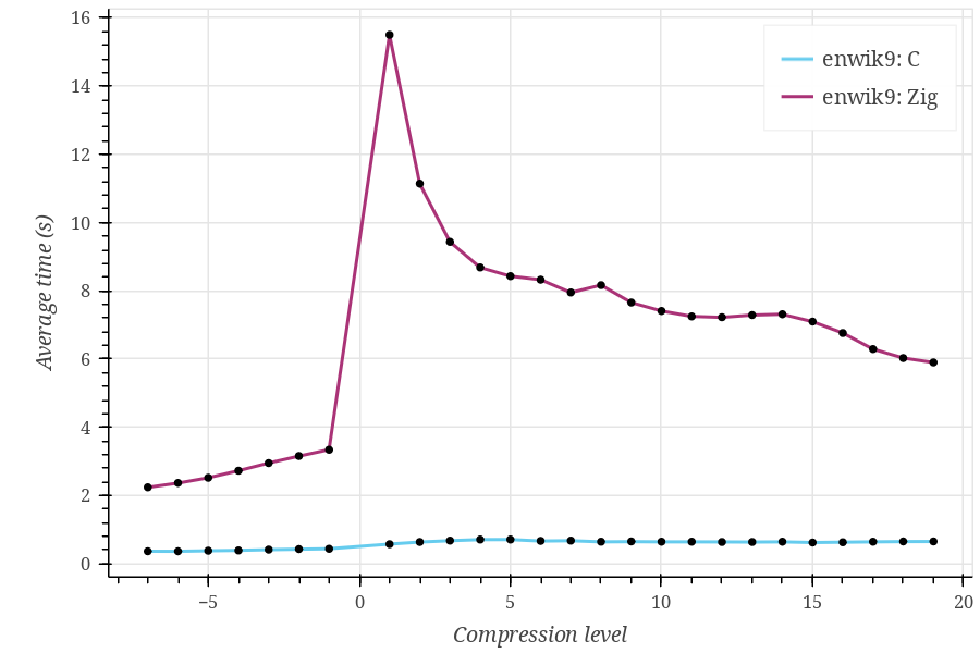 As you can see, Zig performs significantly (~10 times) worse on every tested dataset, and I can’t tell whether this is expected. Also, the Zig curve looks strange, having a huge spike at compression level 1 and rapidly decreasing at higher compression levels.